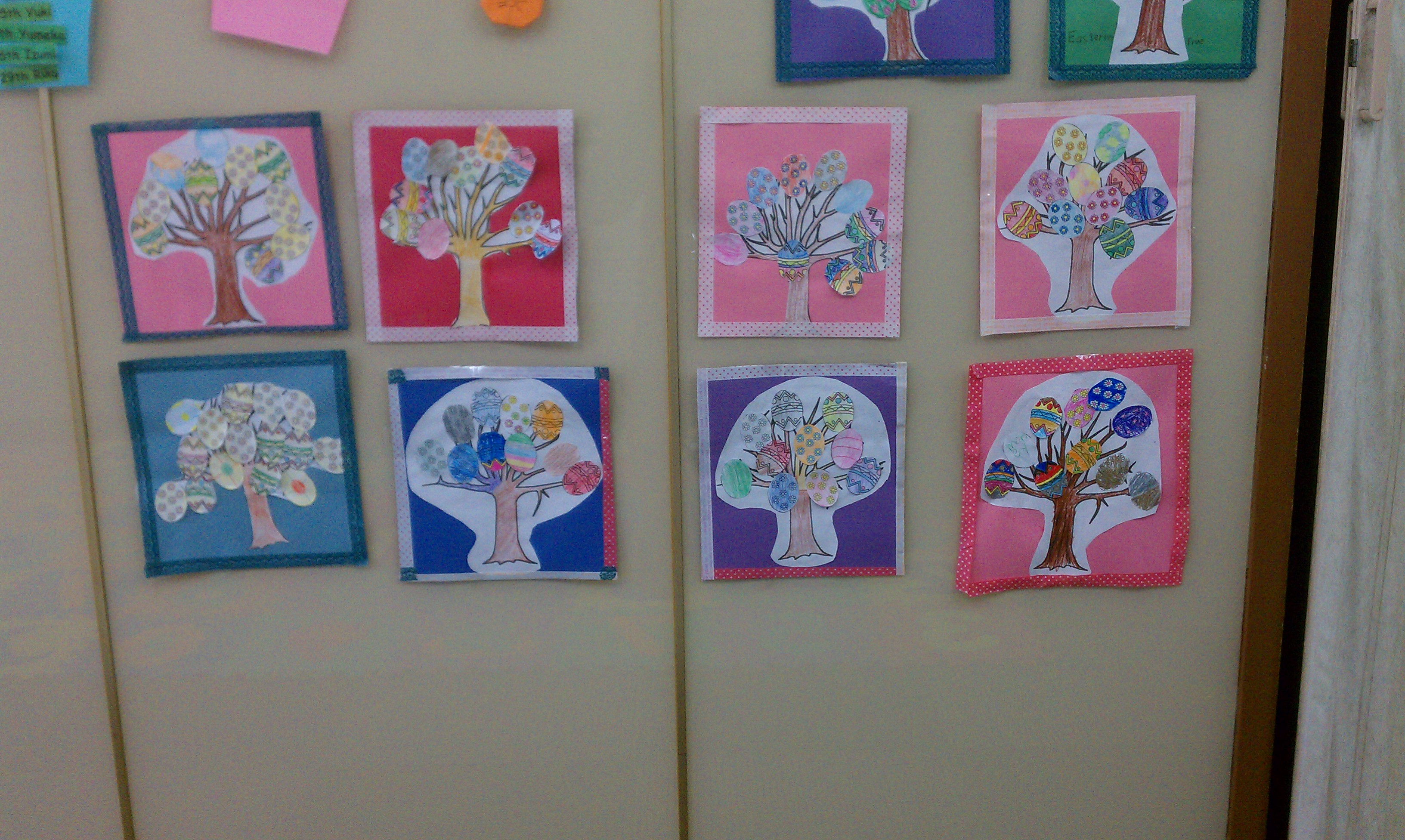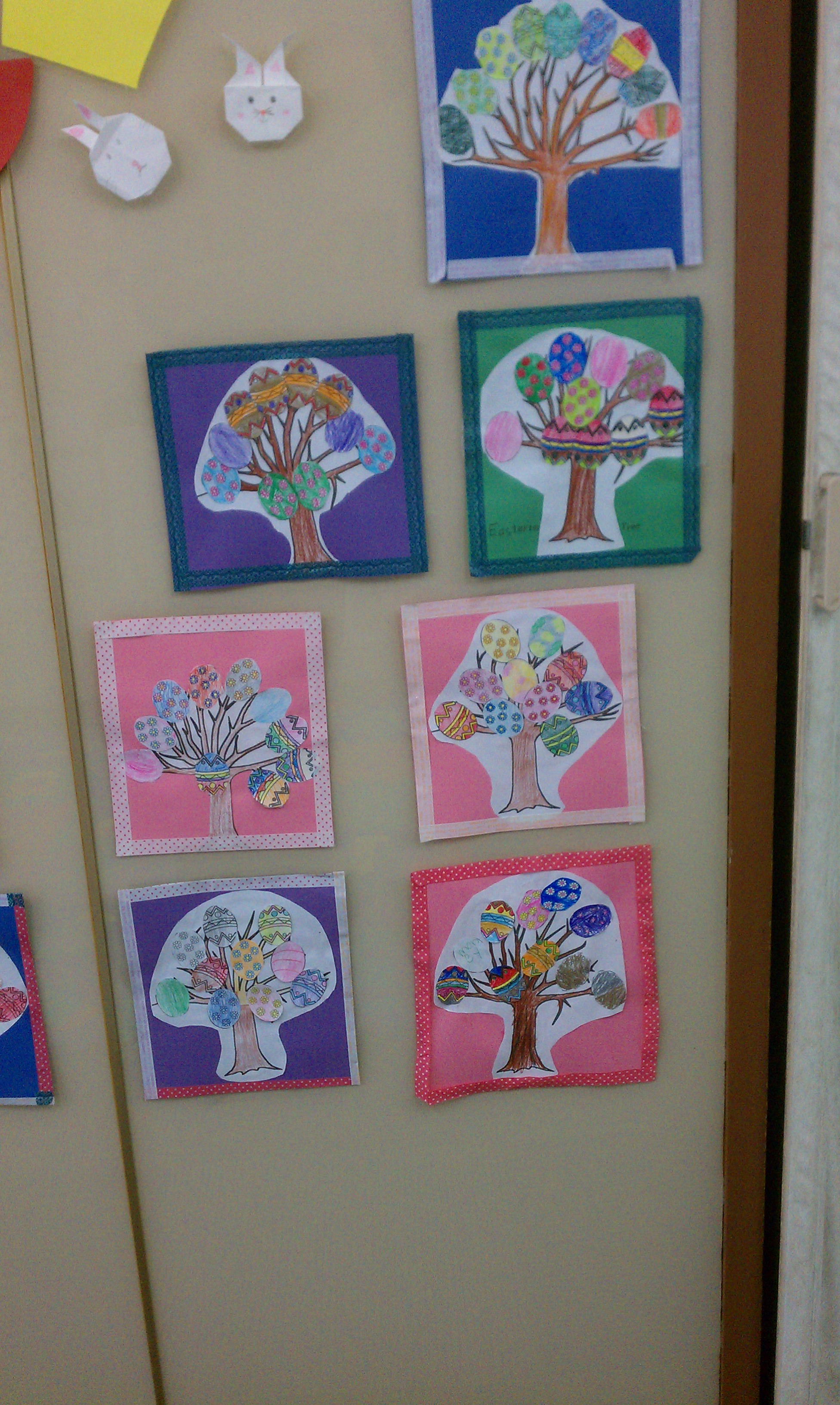 イースタークラフト Posted on April 1, 2013 by Pia Language 先日3月31日はイースターでしたね。 みんなでイースタークラフトを作りましたよ。 まず、プリントされたイースターエッグに色をぬったり、好きな絵を描いたりしたあと、 木の幹にそれらをはりつけてイースターツリーをつくりました。 作品を紹介します。 教室内がとても明るくかわいらしくなりました。