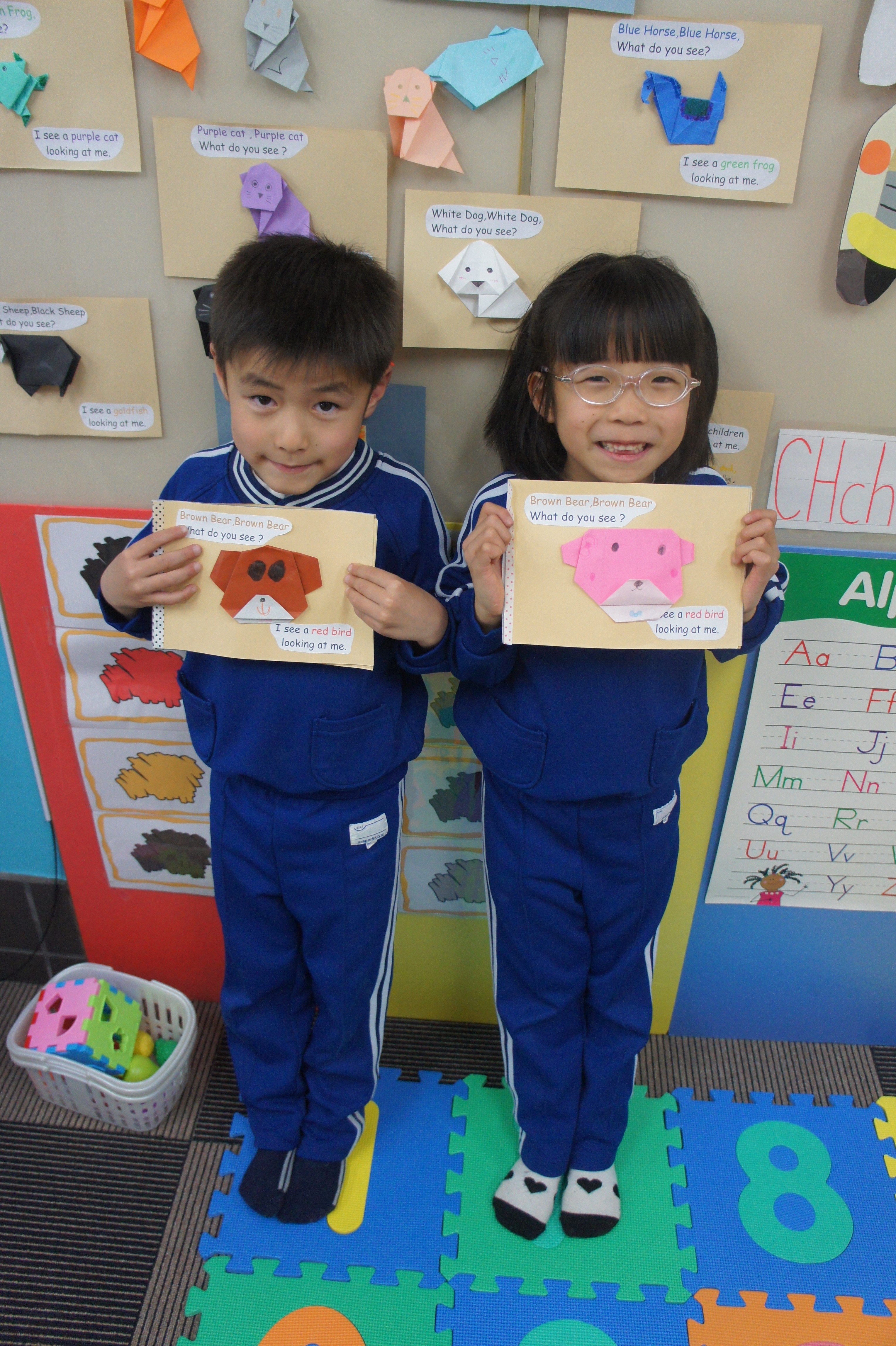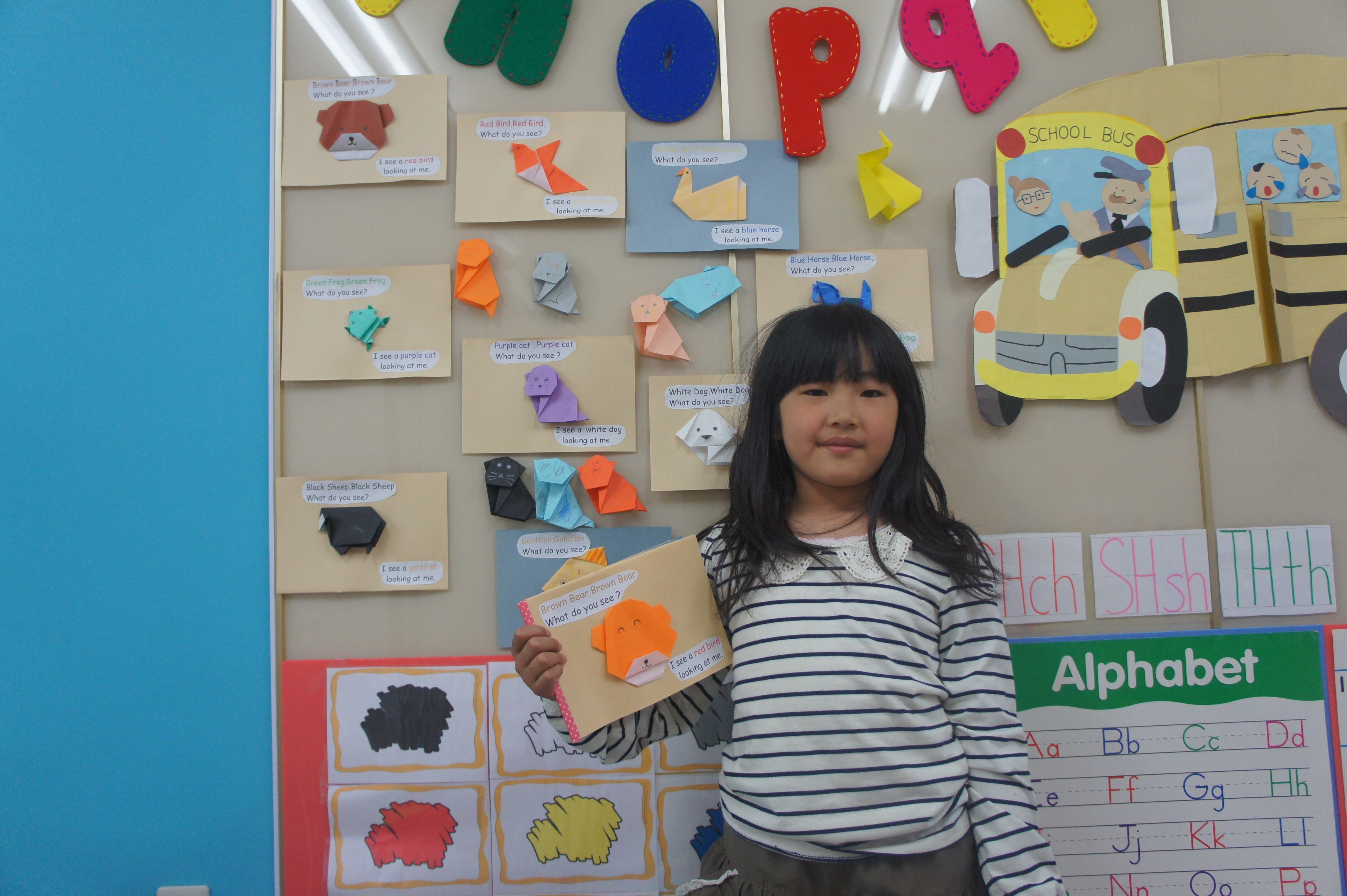 Tiny Learnersのレッスンでは”Brown Bear, Brown Bear What Do You See?”に出てくる動物を毎週一つづつ折り紙で作ってきました。絵本にしてお渡しさせでいただきました。