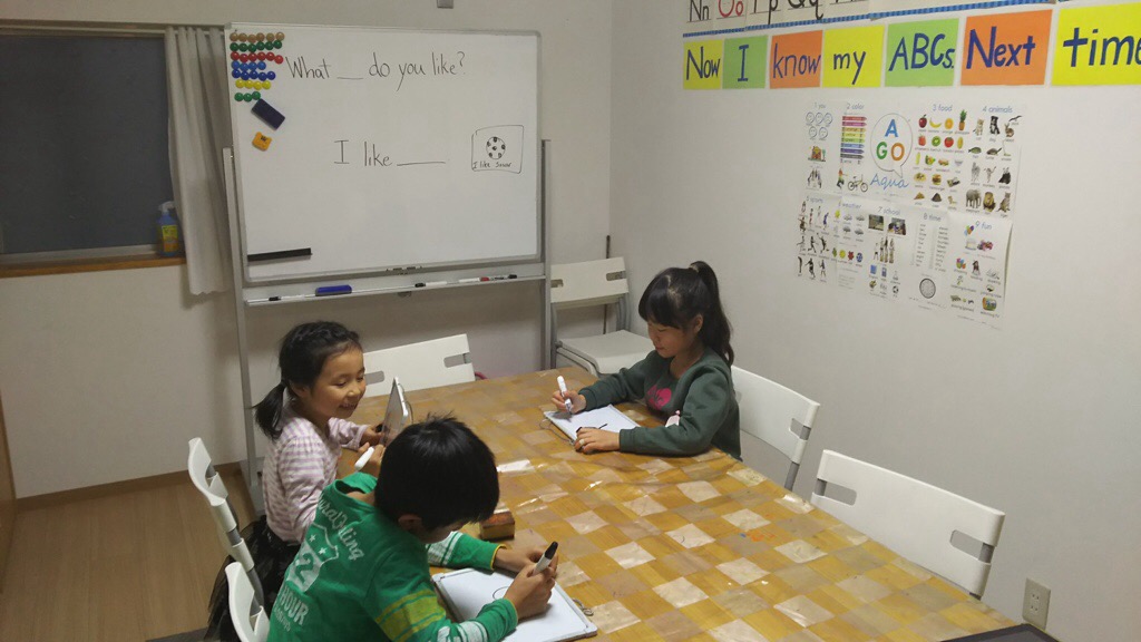 そしてリーダーは英語でカードがどこにあるのかを他の生徒たちに伝えます。他の生徒たちも一人ずつ小さなホワイトボードをもって、その中にリーダーが説明したことを描いていきます。