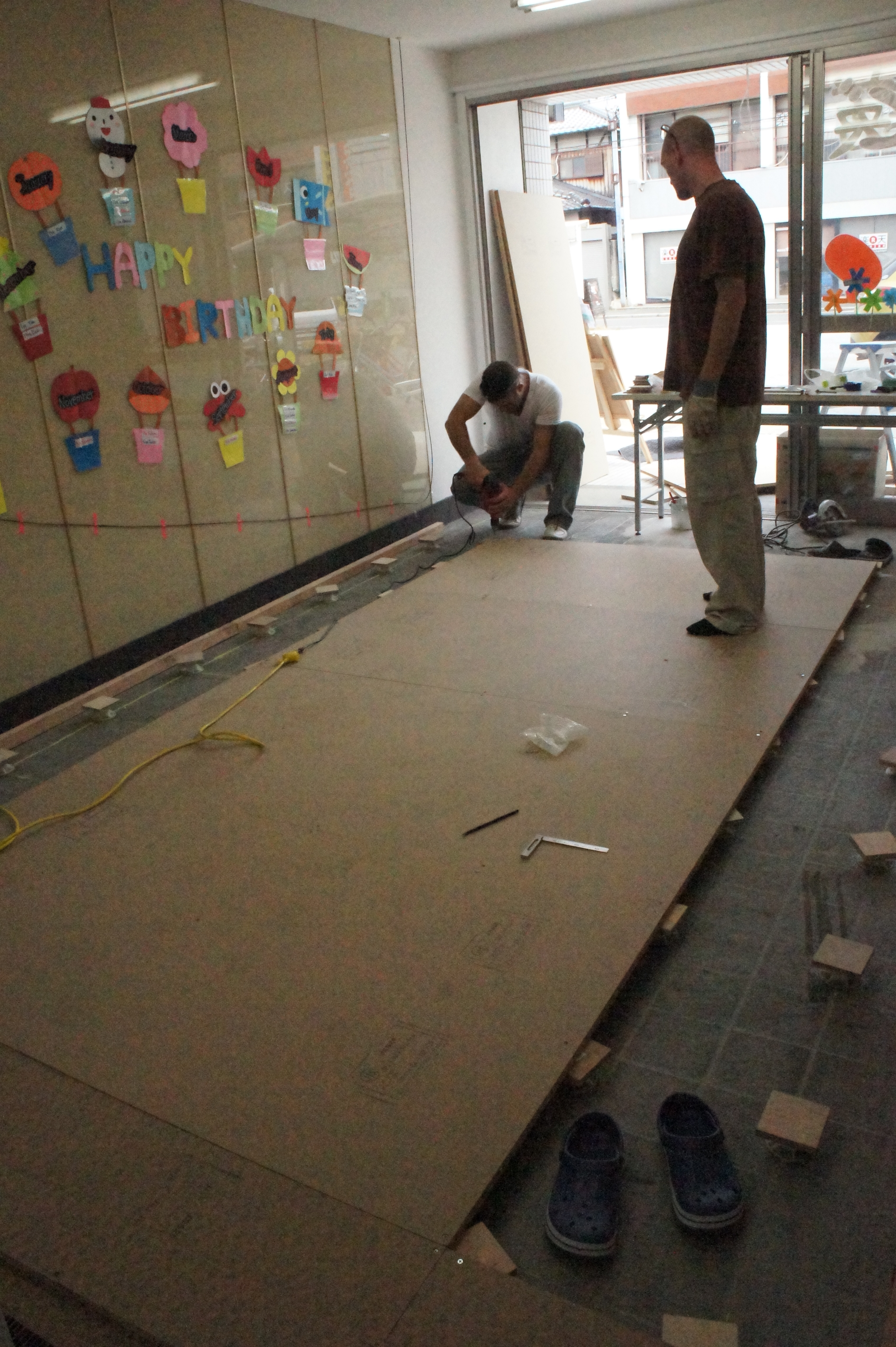 床になる板を置いてゆきます!先ほどの台と板をドリルで固定します。