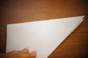 そしてさらにもう一度三角形に折って、真ん中に折り目を作って下さい。折り目をつけたら最後の三角形はいったん広げて下さい。