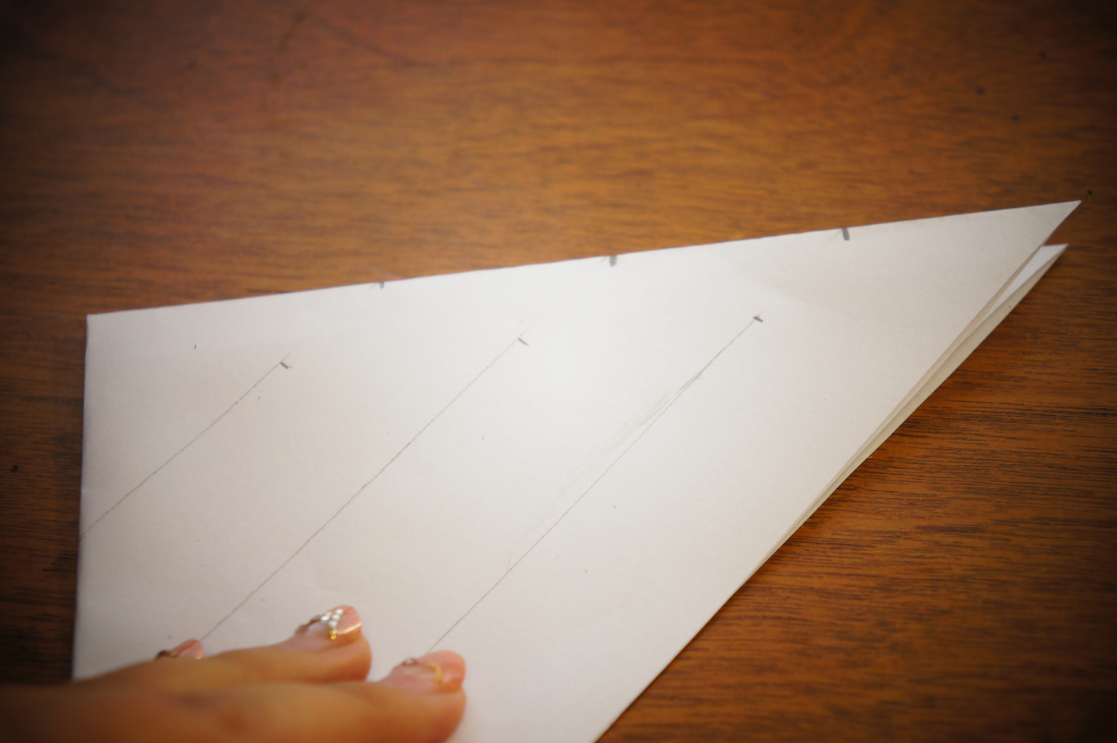 次は、左の写真のように、真ん中の角から折り目に沿って3.5cmずつ測って3ヶ所印をつけます。