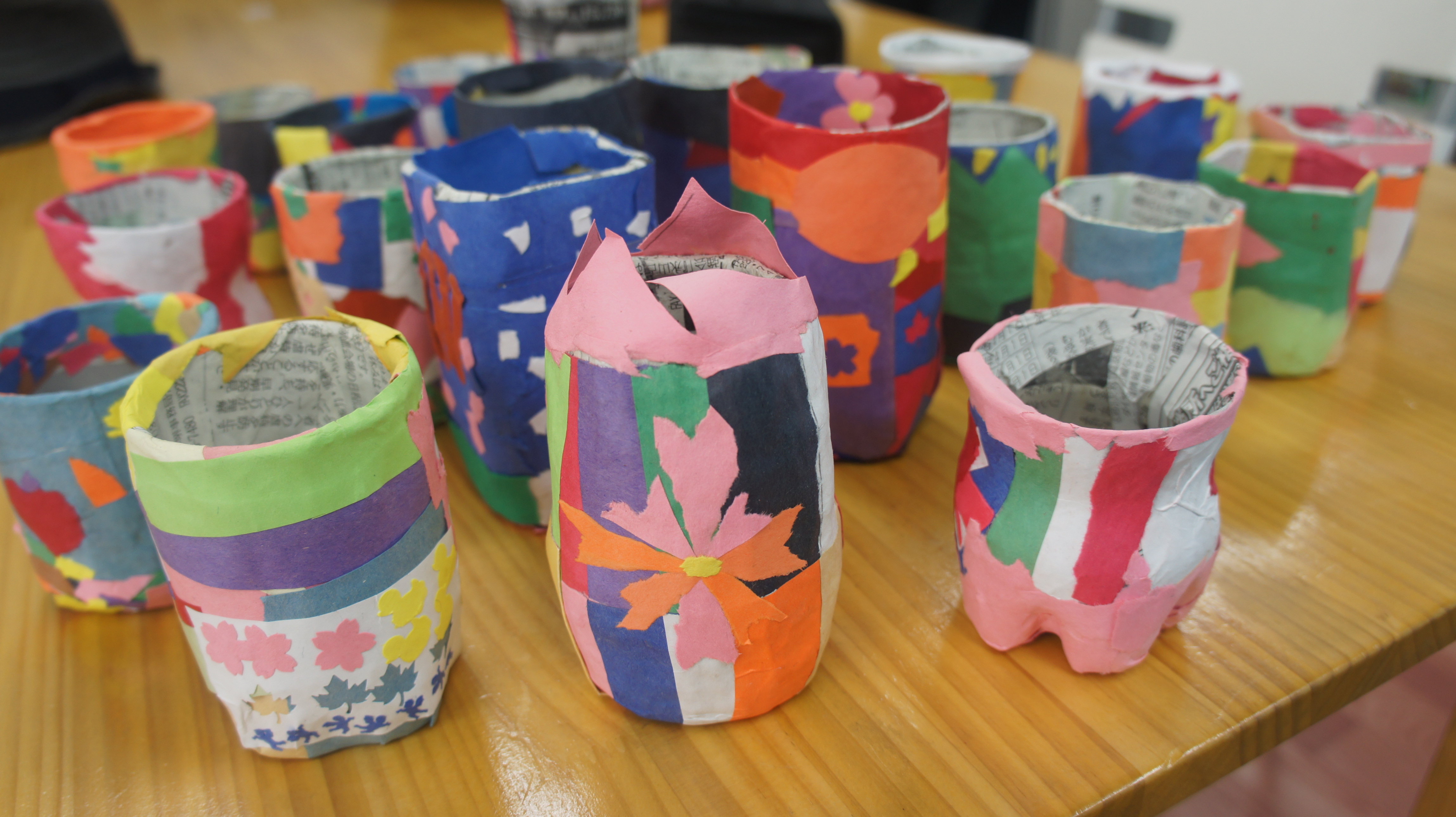 Paper Mache ♪ Posted on July 8, 2014 by Pia Language 先月から小学生の2時間クラスで取り組んできましたPaper Macheですがこんな素敵なのが出来上がりましたよ。 ペーストから作った鉛筆立て。 みなさんそれぞれ思い入れのある物になったのではないでしょうか? こちらの作品は4つあるペットボトルの面を利用して春夏秋冬をイメージして作ったそうです。 すごく素敵ですよね♪