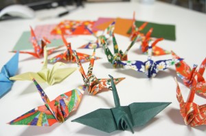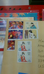 お手紙と一緒に、みんなが作った鶴のおりがみを入れて、封筒には日本らしい切手を郵便局の方にお願いして貼ってもらいました。