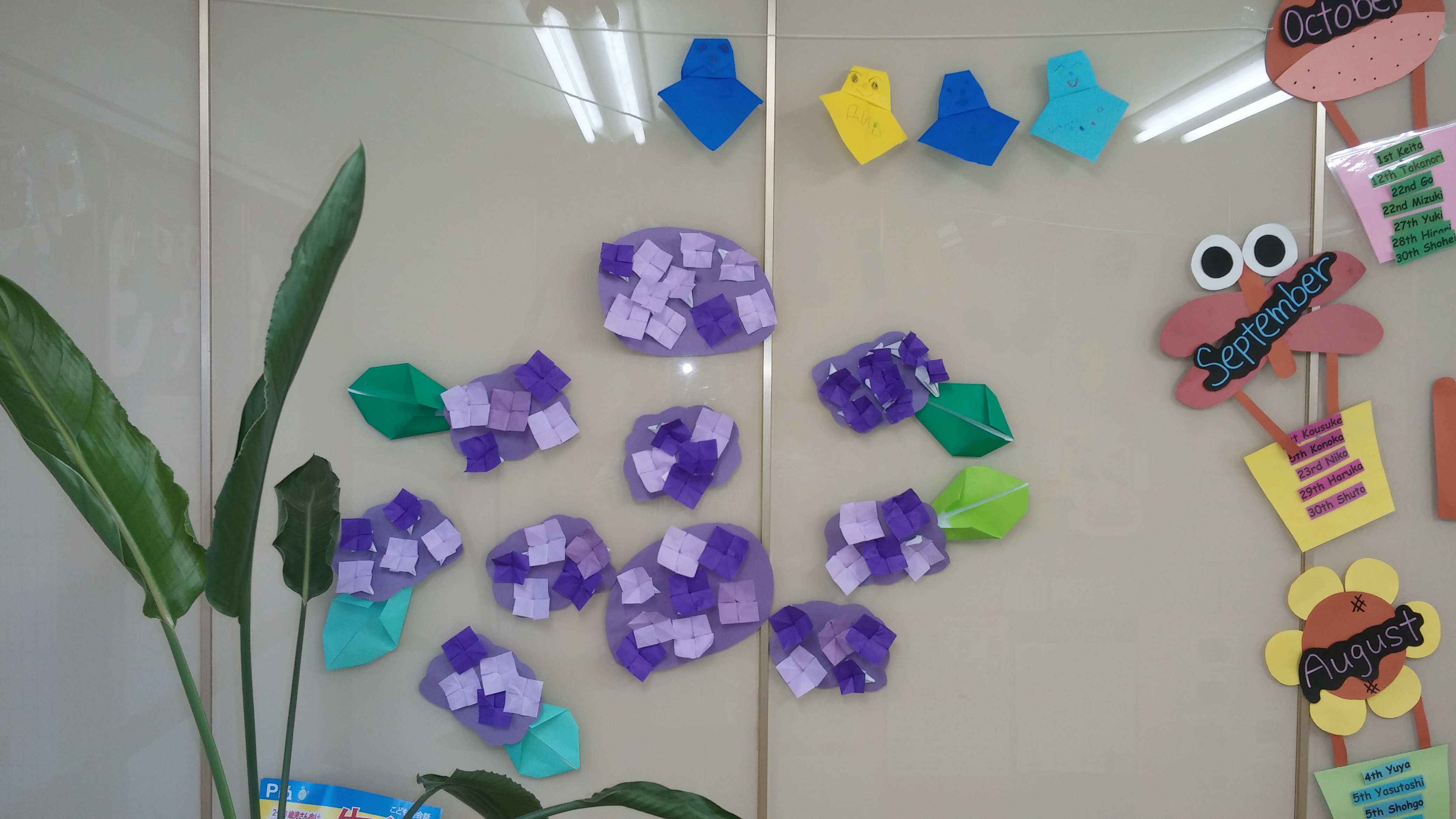 「早く天気になーれ!!」との願いをこめて幼稚園年長児のクラスでてるてる坊主の折り紙に挑戦しました。
